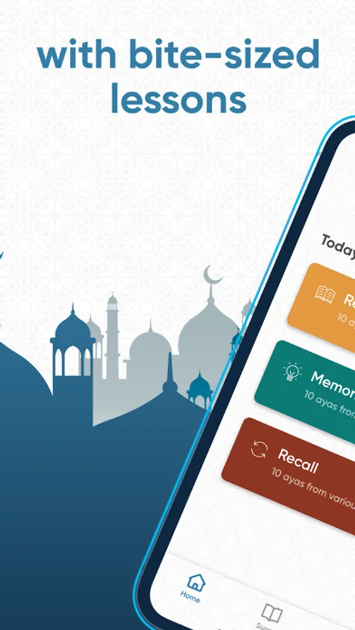Recall Lessons - to build long term retention. Quran Circle adapts to how well you remember the ayahs, and decides how frequently it shows them to you so you don't forget them.