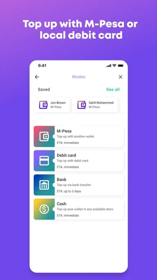 Easily load your account either with cash, other debit and credit cards, bank transfer and using other m-wallets.