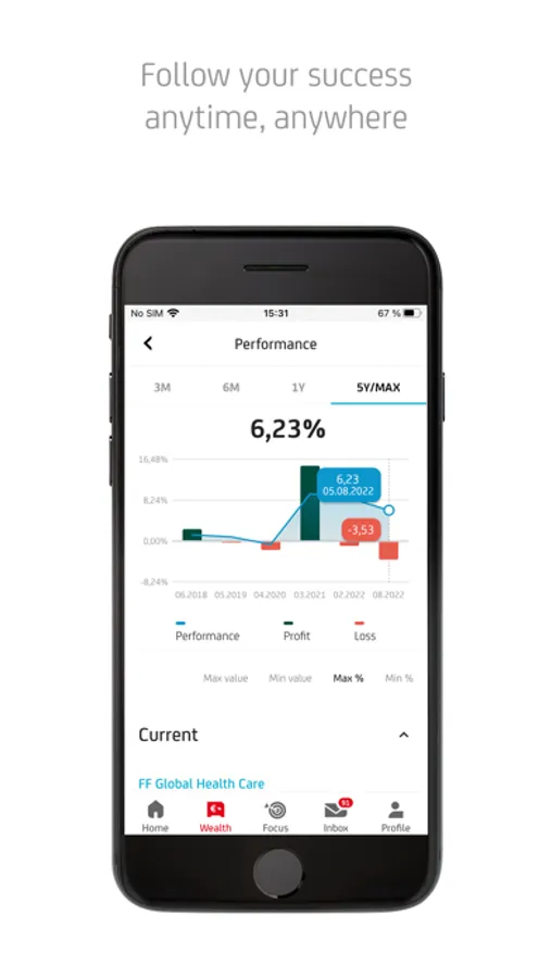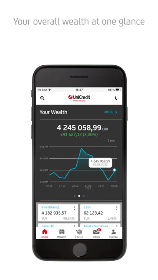 Portfolio evolution shows you the change of aggregated value of your assets within UniCredit Bank in your main currency. Swipe through different time horizons and analyze your portfolio from different perspectives. Keep your wealth under control by understanding how cash flows or evolution of your investments affected your overall portfolio..