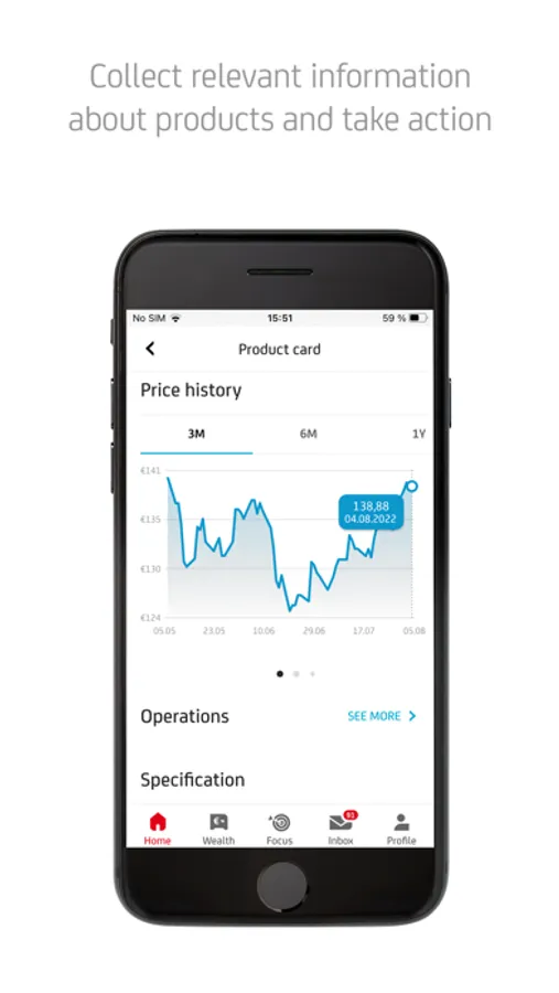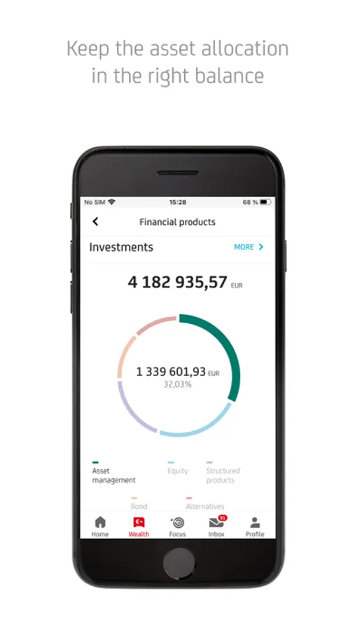 Private Invest has five main areas, which help you to navigate in the menu – Home, Wealth, Focus, Inbox and Profile. The main functions of the app are categorized in widgets in every area. Swipe the widgets left or right to see your portfolio from a different time perspective, or reach additional action buttons. Click on “More” to expand the widget and get full details.