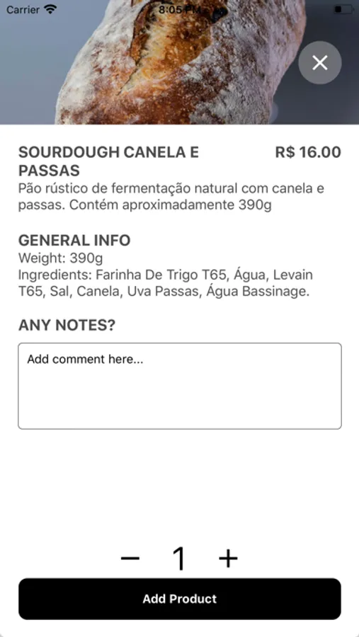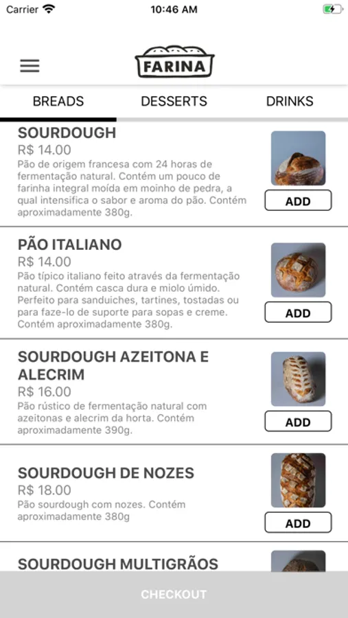 App to order, breads, desserts and drinks from Farina Artesanal