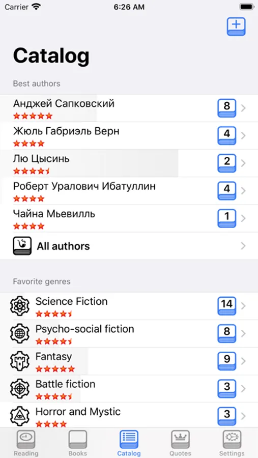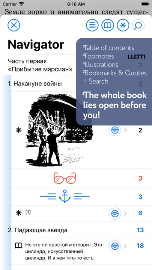 To meet personal preferences, the application has rich settings, including several dozens of customizable parameters. The book index has several sorting modes allowing to find a required writing easily. Reading can be quickly restarted after a break with one touch of the screen. The reader keeps reading statistics and offers developed means of monitoring the reading process.