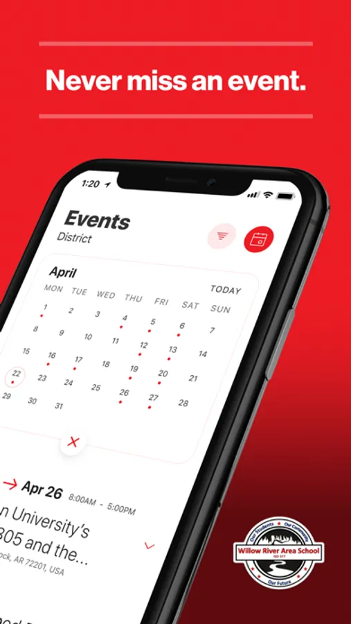 The event section shows a list of events throughout the district. Users can add an event to your calendar to share the event with friends and family with one tap.