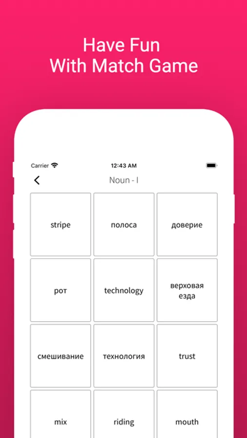 Match Game: Play an addictive matching game to strengthen your word recognition skills. Connect English words with their Russian translations. Sharpen your memory while having fun!