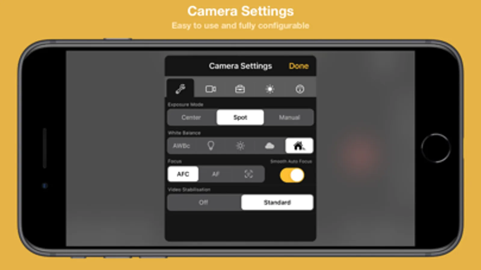 — White Balance, Color Temperature and Tint, Exposure, Shutter Speed, Stabilisation, Flash, Focus, HDR and Red Eye Reduction