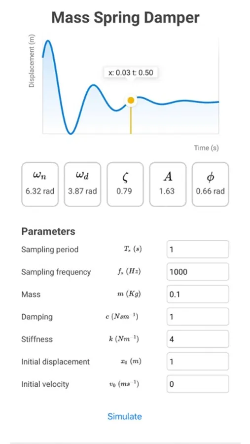 Enter the various parameters of your free vibration mass spring damper system, press 'simulate' and watch the calculator plot a displacement over time graph of the system.