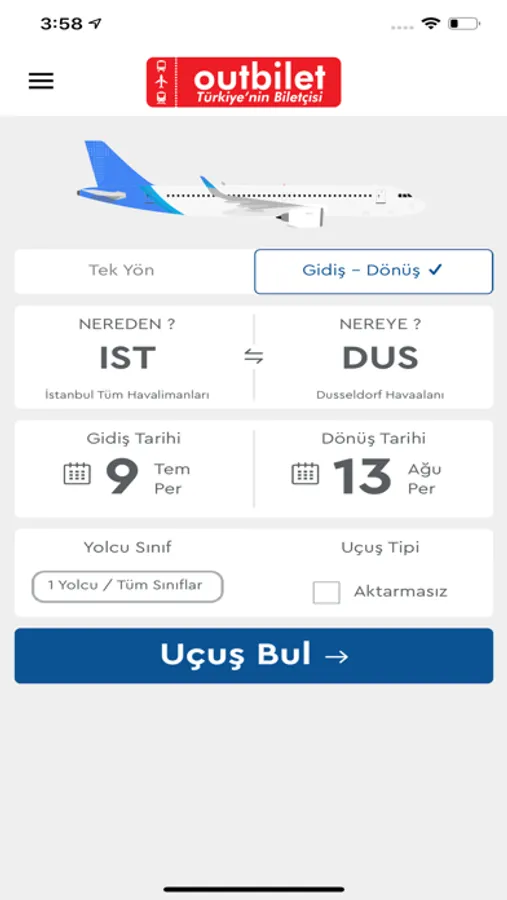 OutBilet uygulaması ile dakikalar içerisinde uçak bileti satın alabilirsiniz.