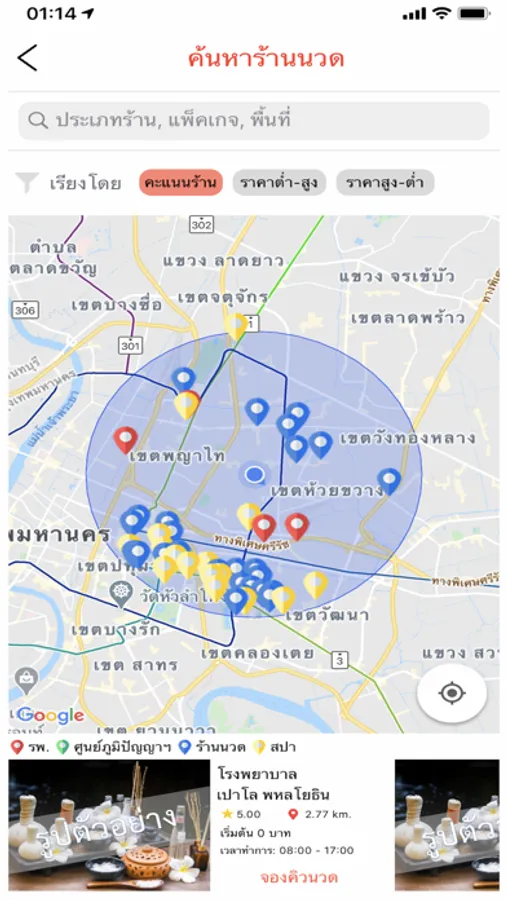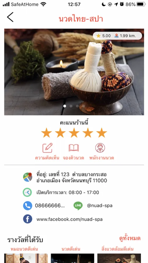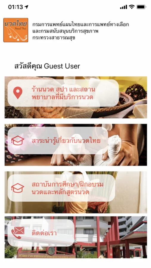 Application นวดไทยสามารถค้นหาสถานประกอบการเพื่อสุขภาพที่ได้รับการรับรองจากหน่วยงานราชการ ได้แก่ร้านนวดไทย สปาไทย และสถานพยาบาลที่ให้บริการนวดเพื่อการรักษา