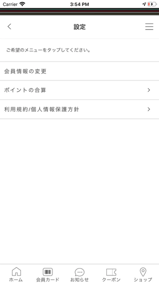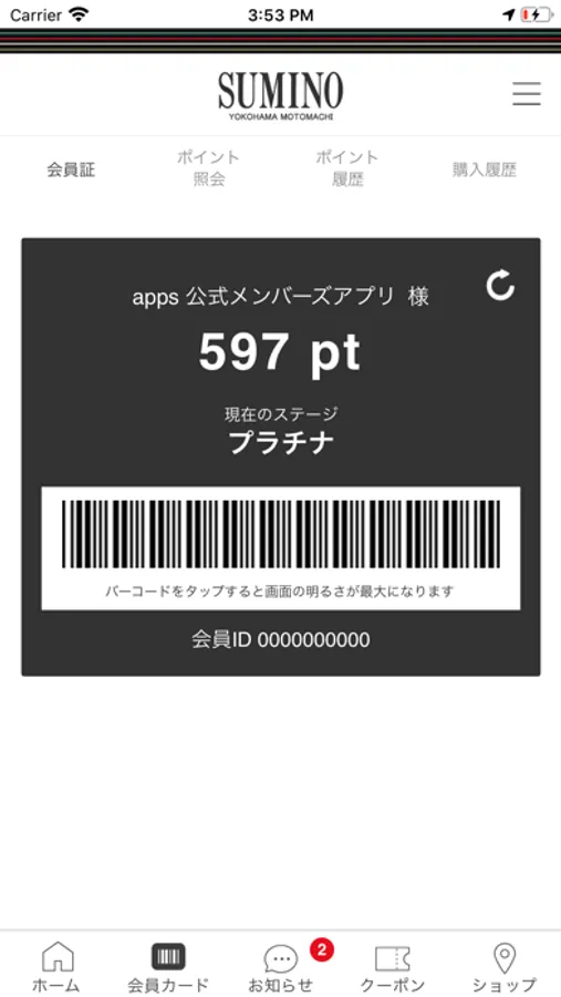 店舗でのお買い物の際にご利用いただける会員カードが表示されます。