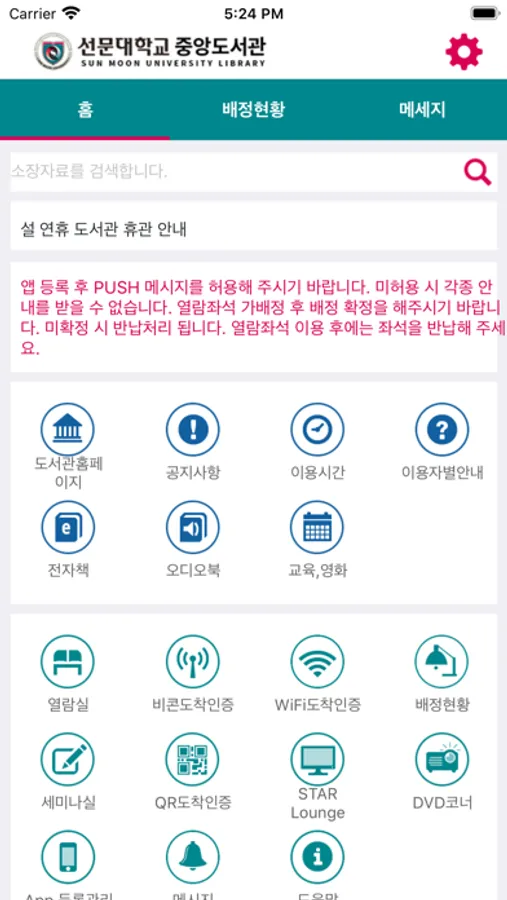 선문대학교 중앙도서관은 모바일 앱(APP)을 개발함으로써 iOS를 통한 서비스를 제공하게 되었습니다. 앱(App)을 통해 도서관소개, 이용안내, 통합검색, 열람실 배정, 스터디룸 예약 등 도서관에서 제공되는 모든 서비스를 동일하게 이용할 수 있습니다.