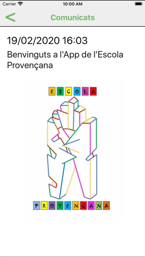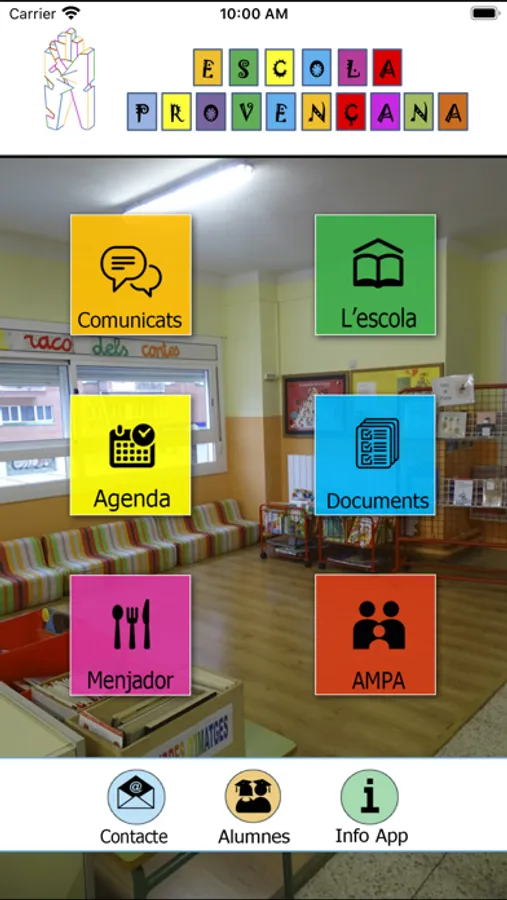 Sistema de comunicats de l'Escola Provençana de l'Hospitalet de Llobregat. L'aplicació permet una comunicació directa entre el centre i els seus alumnes o pares dels alumnes. Consta d'una primera plana de registre on s'identifica l'usuari. A continuació apareix un menú amb diverses opcions: secció de comunicats enviats per l'escola -ja siguin comunicats generals o personalitzats-, secció "L'escola" amb l'accés directe a la web del centre, secció Documents, secció Agenda, secció Menjador i secció AMPA. A la barra inferior hi ha la secció "Contacte" amb les dades de contacte de l'Escola, secció Alumnes i secció Info App.