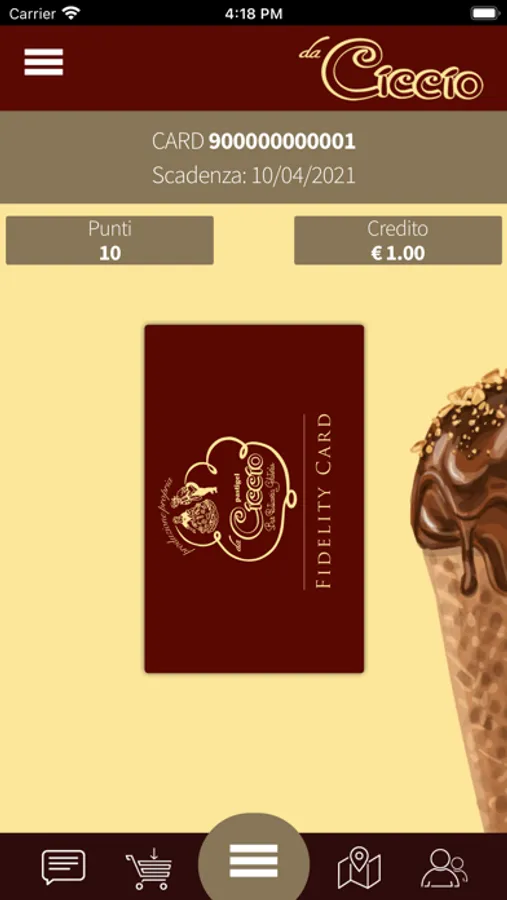Con la App Da Ciccio siamo ancora più vicini ai nostri clienti, infatti avvalendoci dell'innovazione tecnologica puntiamo a migliorare il nostro sistema di incentivazione con la Fidelity Card virtuale. I nostri clienti potranno installare la App sul proprio dispositivo mobile ed avere in questo modo tutte le informazioni sulla propria card e sui vantaggi guadagnati. La App é inoltre uno strumento di comunicazione attraverso il quale i nostri clienti saranno sempre informati sulle promozioni e le iniziative del nostro negozio.