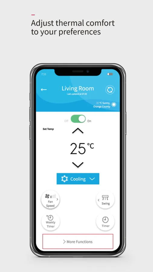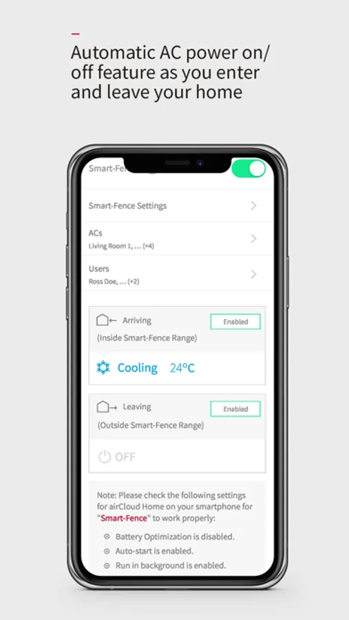 You can link the AC operation to your location. When a user is arriving and enters the pre-set perimeter, the air conditioner automatically turns on to create a welcoming atmosphere. When users exit the perimeter, air conditioners turn off or adopt an energy-saving temperature.