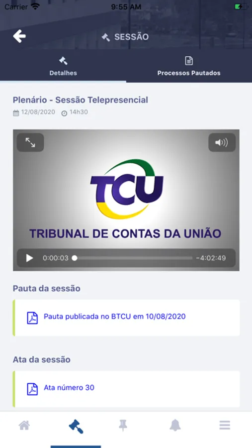 1. Sessões - Vídeos, atas e pautas das sessões dos Órgãos Colegiados: Plenário, Primeira Câmara e Segunda Câmara;