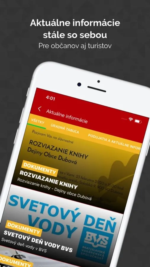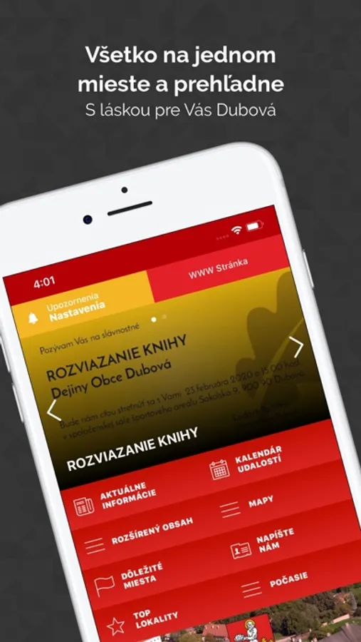Mobilná aplikácia obce Dubová. V aplikácii nájdete aktuálne informácie z diania v obce, kalendár, dôležité kontakty aj top lokality. Môžete si nastaviť upozornenia na rôzne udalosti, od noviniek, cez udalosti kalendára až po denné sumáre. Obec Vám v prípade kritickej situácie (napr. povodne) môže poslať upozornenie priamo do aplikácie.