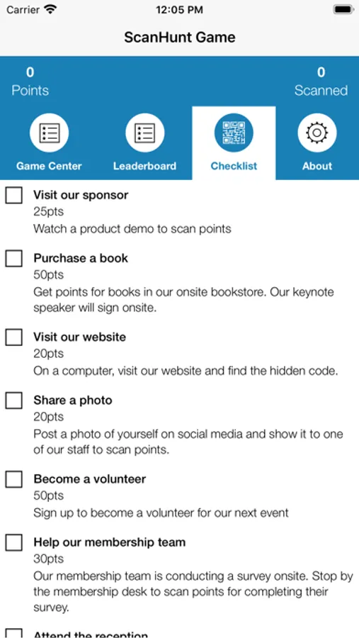 Your ScanHunt® organizer will provide you with a participation code for a specific scavenger hunt. Enter the code to load your ScanHunt® event game and start completing activities. Use the Checklist tab to see which activities you need to complete.