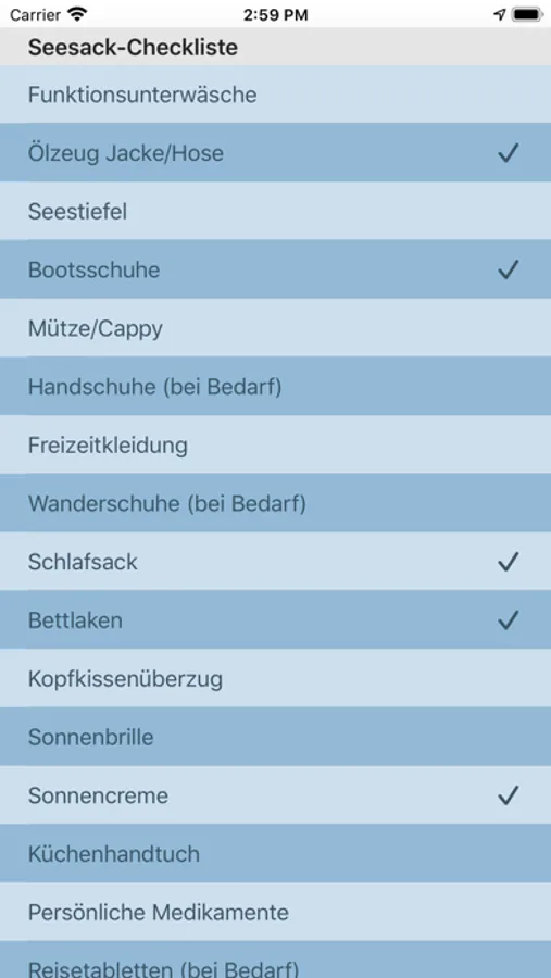 Wer Bedenken hat in seinem Gepäck etwas zu vergessen wird mit Hilfe einer interaktiven Checkliste über die Funktion „Persönliche Ausrüstung“ detailliert informiert welches Equipment nicht im Seesack fehlen sollten.