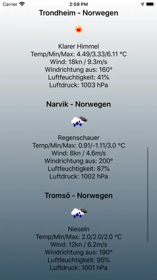 Informationen über das aktuelle Wettergeschehen in dem aktuellen Seegebiet als auch den Crewwechselhäfen der Saison 2023 (Wind in Bft und Richtung, Temperatur, Niederschlag).