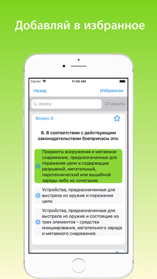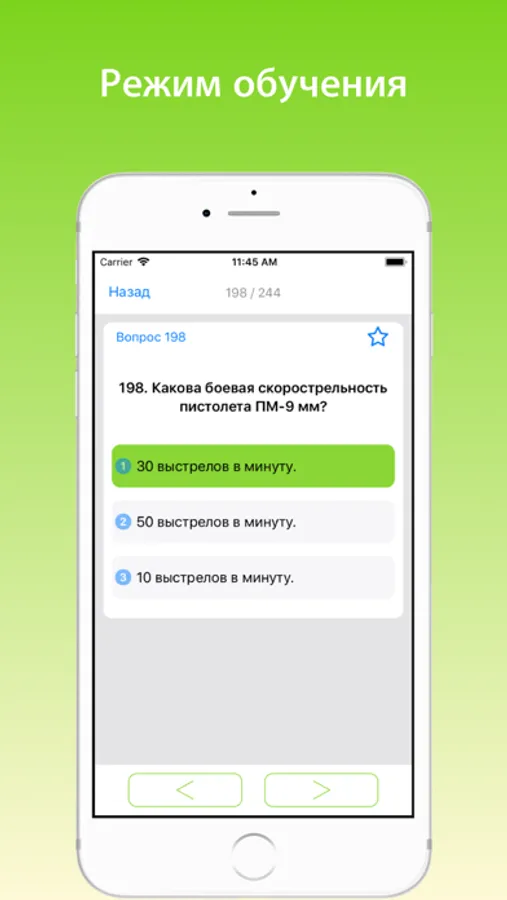 - режим "Учить вопросы", который позволяет поэтапно изучить все вопросы выбранной категории.