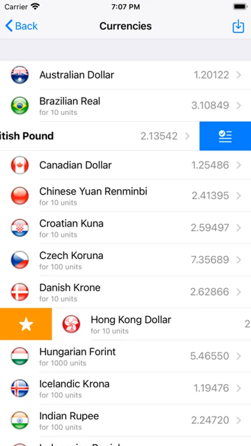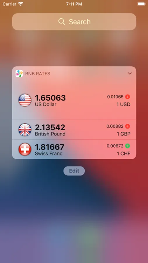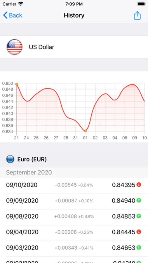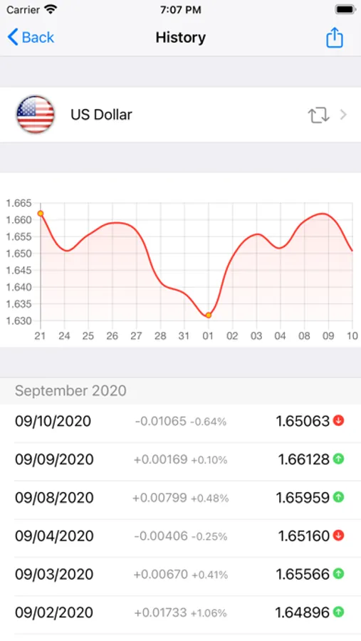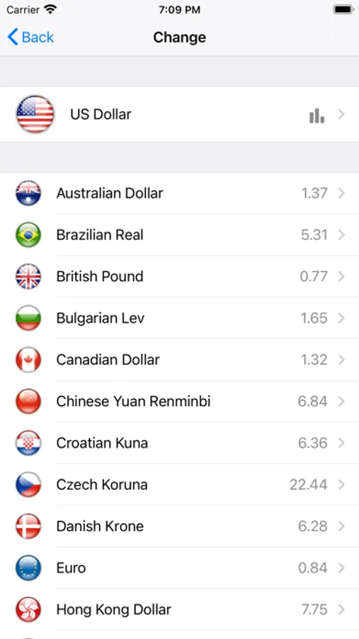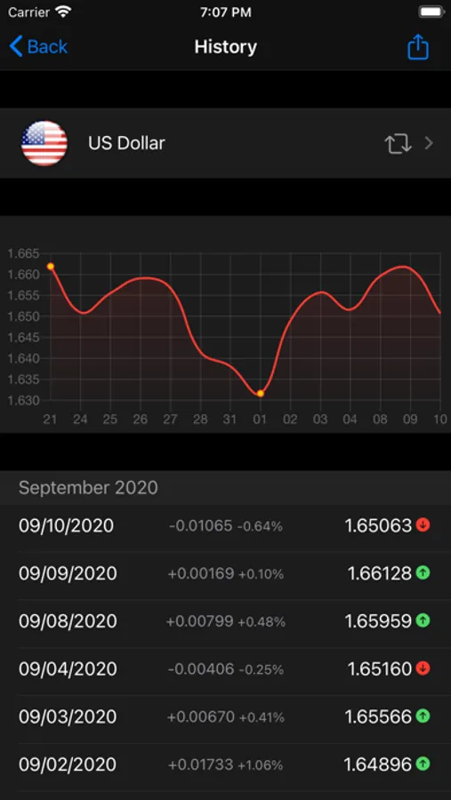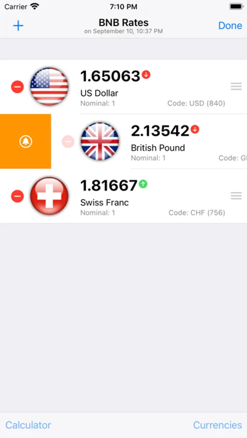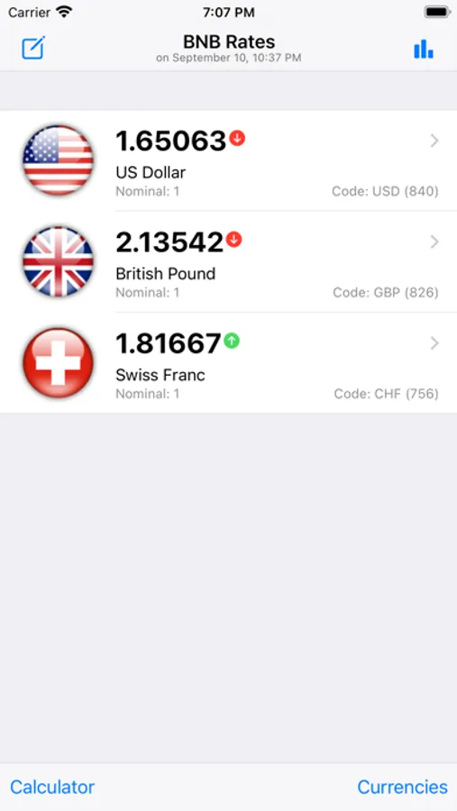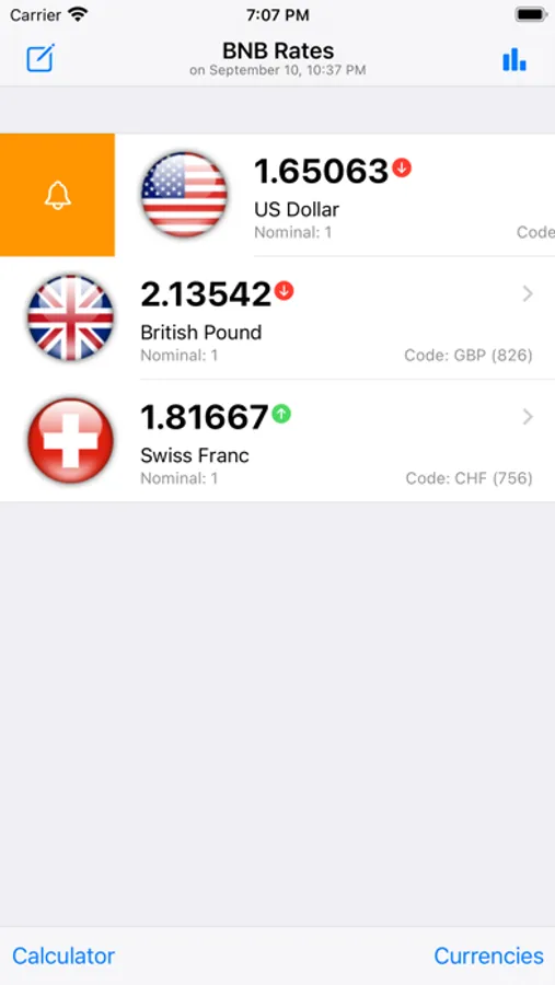 On the main screen, you can set up to 6 currencies for detailed tracking of exchange rate changes (last 14 values), as well as set an alert when it changes by a specified relative value.