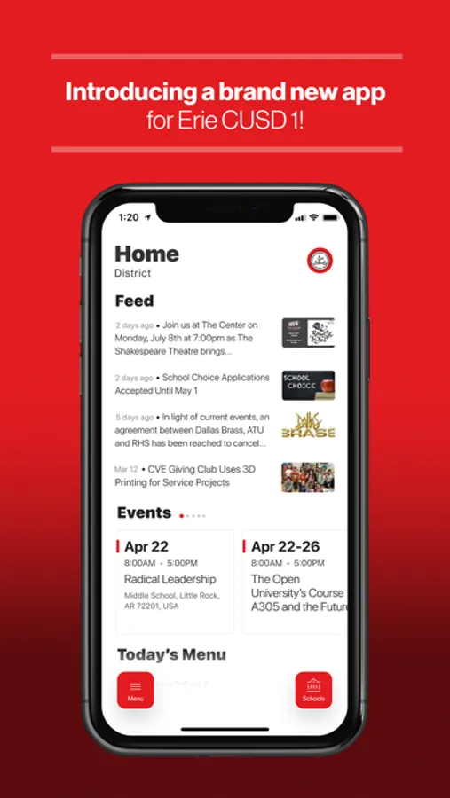 The event section shows a list of events throughout the district. Users can add an event to your calendar to share the event with friends and family with one tap.