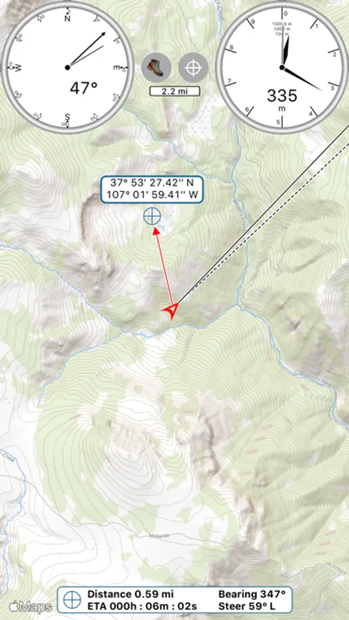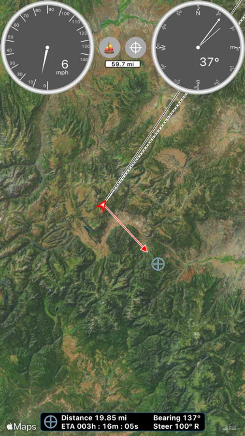 Tap to set a destination and the map displays your distance, bearing, direction to steer, and ETA to the destination.