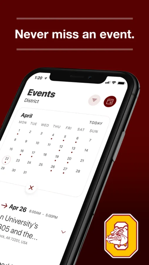 The event section shows a list of events throughout the district. Users can add an event to your calendar to share the event with friends and family with one tap.