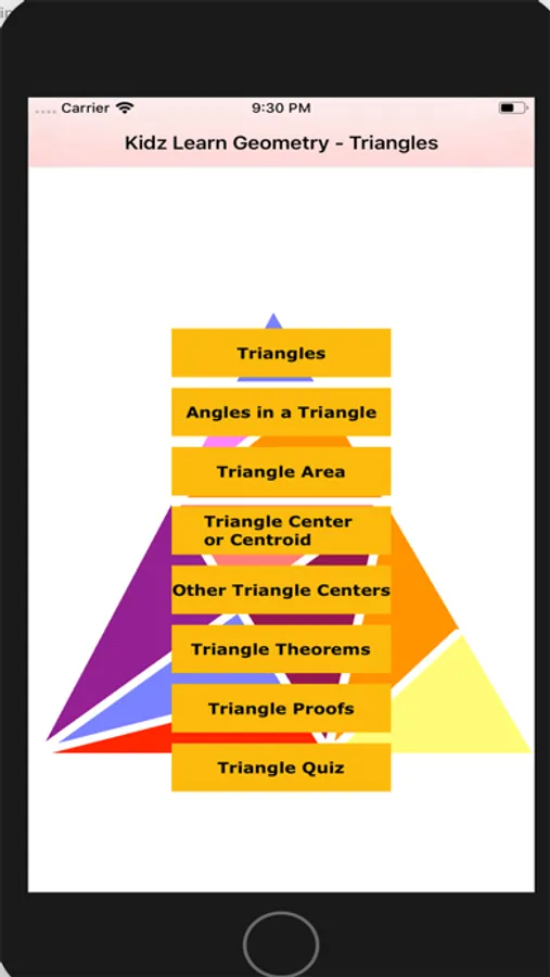 "Triangles in Geometry" is an educational app that describes the triangle basics - (Acute, Obtuse, Right Angle) and then progresses to explain various centers in a triangle - (Centroid, Incenter, Orthocenter) and Area. The app also summarizes and explains with images, triangles Theorems, and Postulates ( Proofs). Review questions (Quiz) at the end of the section has a few problems based on the triangle Theorems and Postulates.