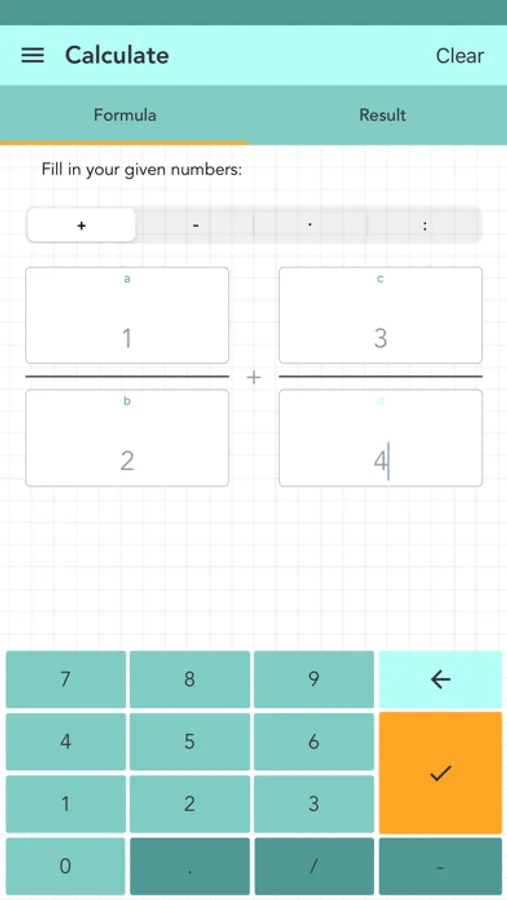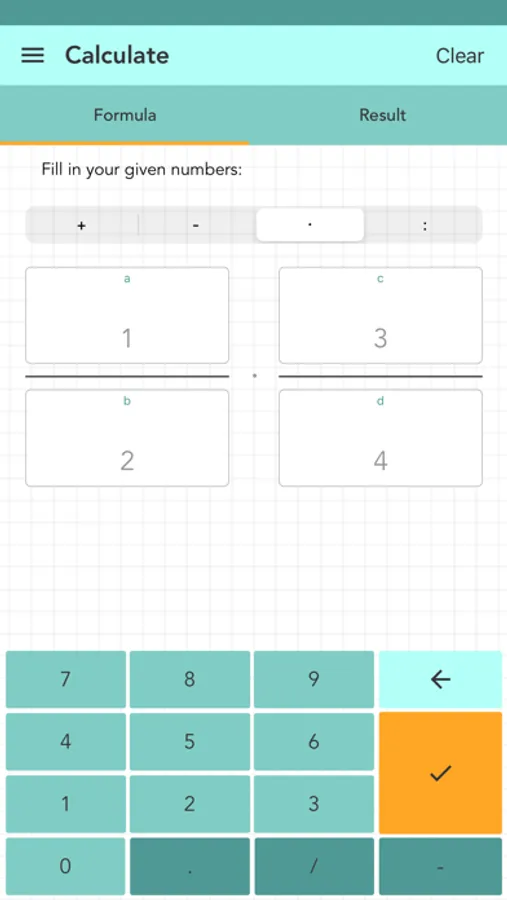 Add, subtract, multiply or divide two fractions of your choice. Therefore you must enter 4 variables. Decimals and fractions are supported. The solution is shown step by step. All calculations are stored in the history. The final solution can be shared.