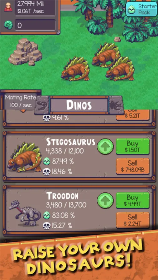 • Raise dinosaurs – Buy/sell dinos from prehistory in your idle zoo