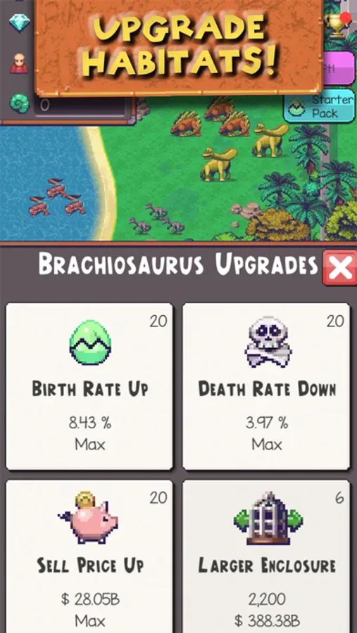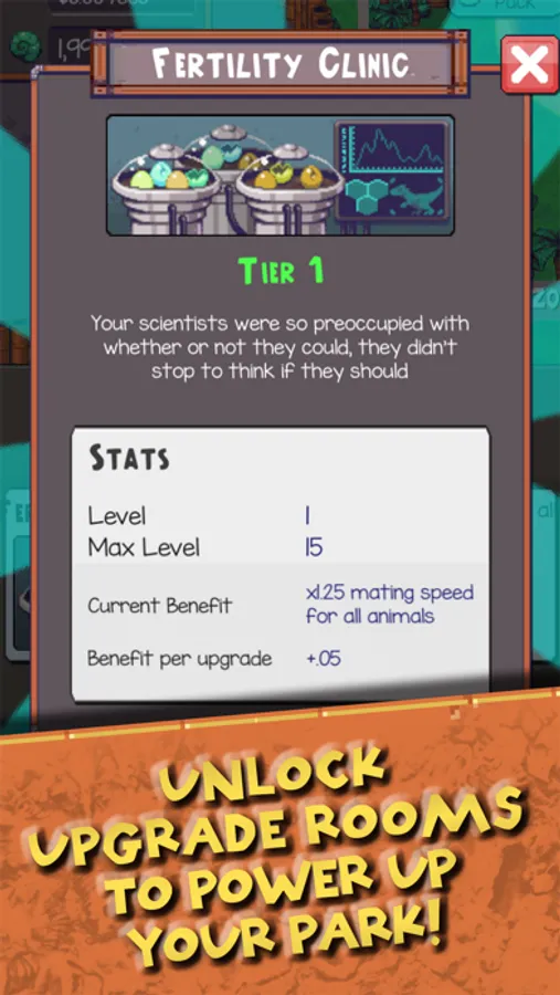 • Manage a zoo and invest in improvements that increase dino birth rates