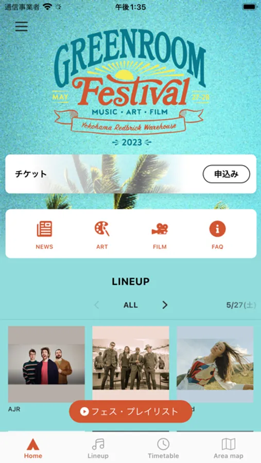 本公式アプリでは、タイムテーブルの作成、各アーティストのプレイリスト試聴、各種通知機能を備えています。是非このアプリを使ってGREENROOM FESTIVAL’23をお楽しみください!