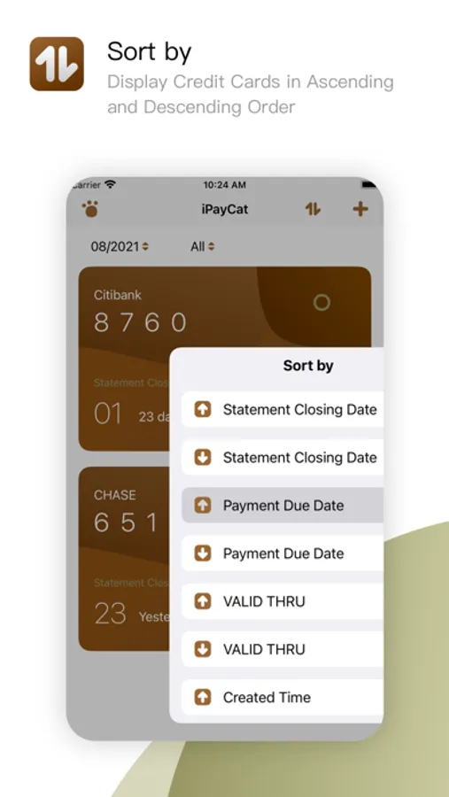 @ Sort by: Display Credit Cards in Ascending and Descending Order (by Statement Closing Date, Payment Due Date, Expires, and Created Time).