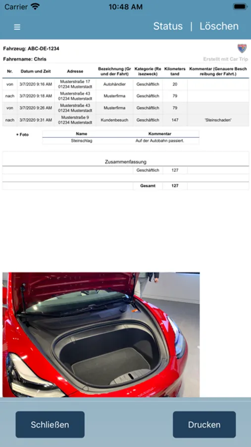 Do you need a printout of the logbook for your documents? Then you can easily print your logbook as a tabular list. If one of your trips contains photos, they are listed below with and marked separately. Photos can also be saved separately.
