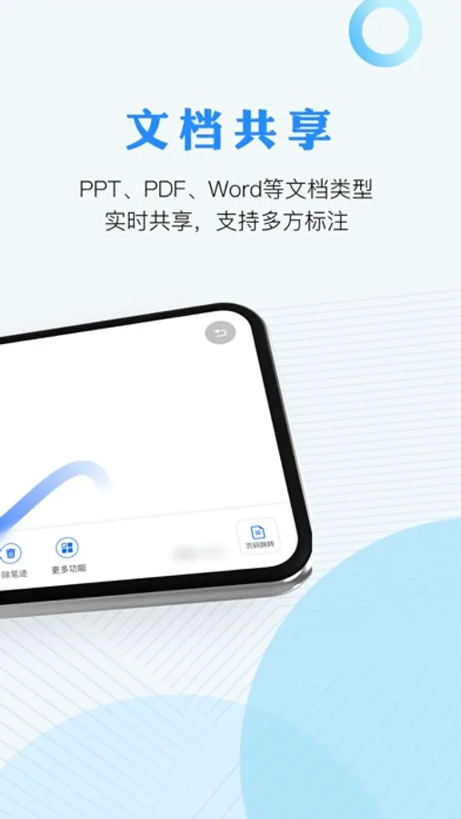 支持PPT、PDF、Word等文档类型实时共享,可多人同时标记文档。画板根据文档实际大小自适应调整,实现文件共享的最佳效果。