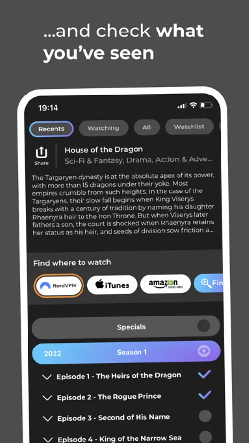 See all your TV shows, their seasons, episodes, airing dates, plot summary and more. Mark series as "Watched" by episodes or whole seasons.