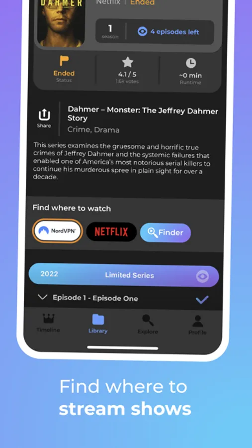 A satisfyingly simple overview of all the recent and upcoming episodes of the TV shows you're following. Easily mark an episode "Watched" with a tap.