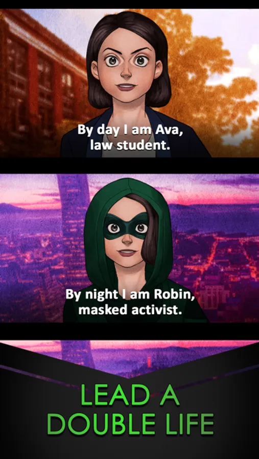 Robin takes you into the world of a young adventurous student who’s willing to do anything to save the planet from the foretold disaster. Underneath her mask and costume, Ava is determined to change things. But such great responsibilities cannot fall to one person alone and your help will be precious. Superheroine with a big heart or rebel activist - you get to choose how you want to take action.