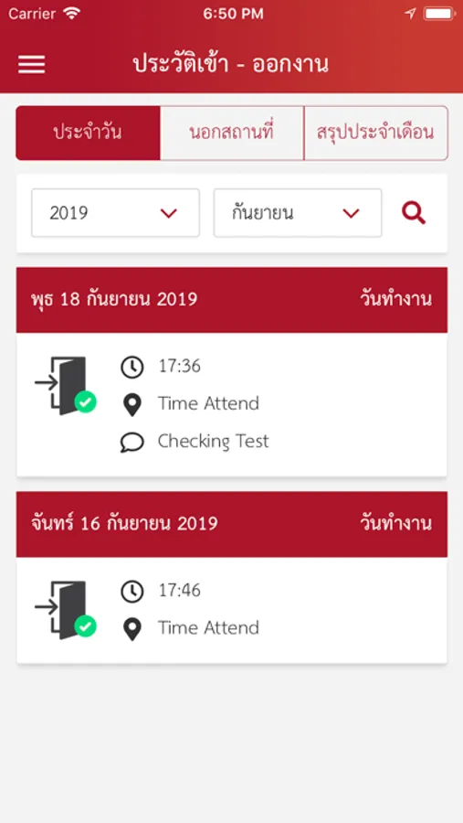 - ดูข้อมูลการบันทึกเวลานอกสถานที่ สามารถเลือกดูเป็นรายเดือนย้อนหลังได้
