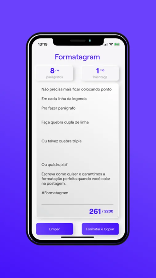 Giving spaces on Instagram is often a difficult task and after publication, the text is not always as desired, this application solves the problem. Format captions like a pro.