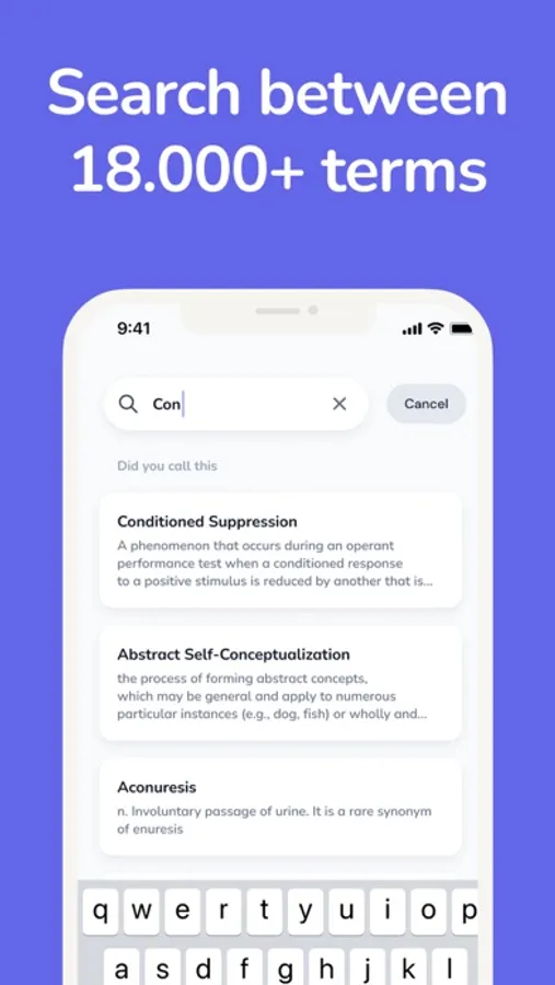 Access a vast collection of 18,000+ up-to-date psychological terms, from A to Z. Whether you're a student, professional, or simply curious, our app covers it all.