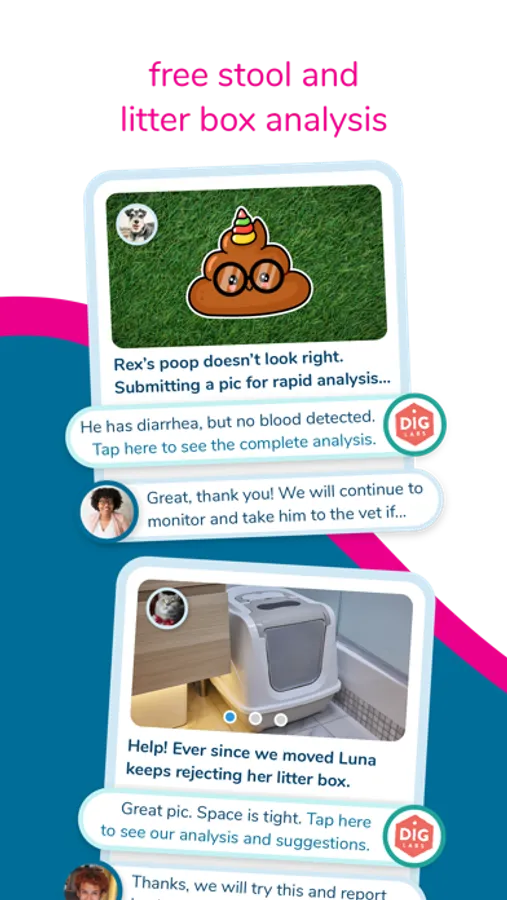 Digestive health insights are only one photo and 15 seconds away. Get free stool and litter box analysis whenever you need it or want it.