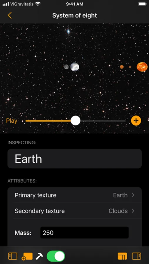 The key scenario of using the app Is to setup your scene in the Creation Mode and that check how it is changing during the simulation. Then go back to Creation Mode, change a few initial parameters and then check how it affects the simulation.