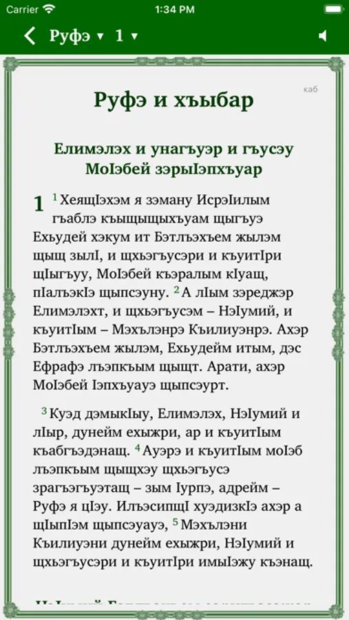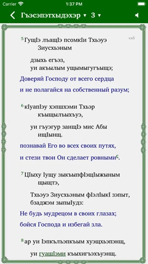 This Scripture app facilitates Bible study in the Kabardian-Cherkess language. The Russian translation (NRT) can optionally be added in parallel to the Kabardian-Cherkess text. Users can highlight verses in different colors, make bookmarks, write notes and view their reading history.