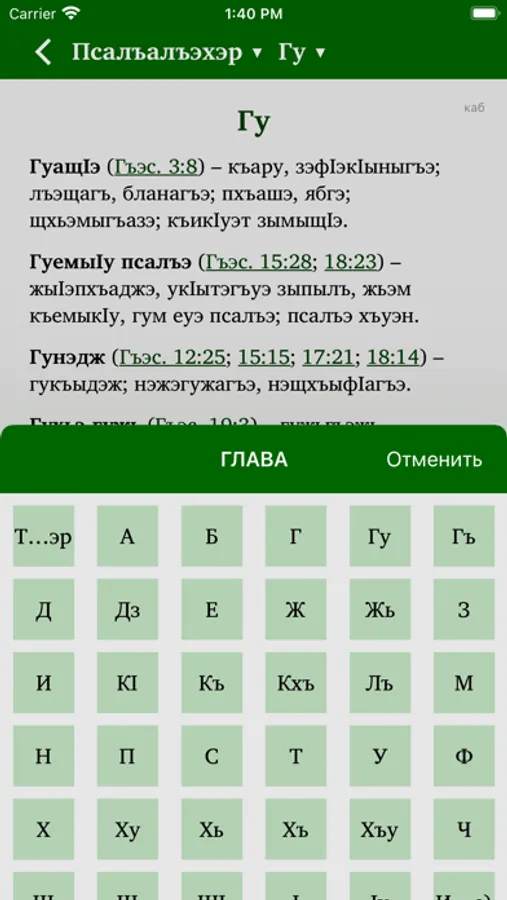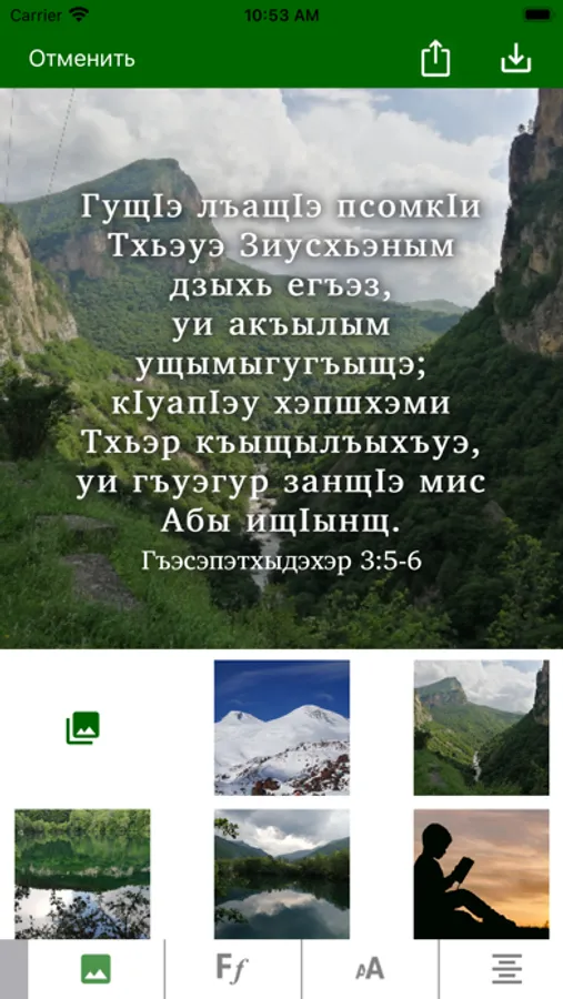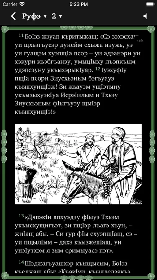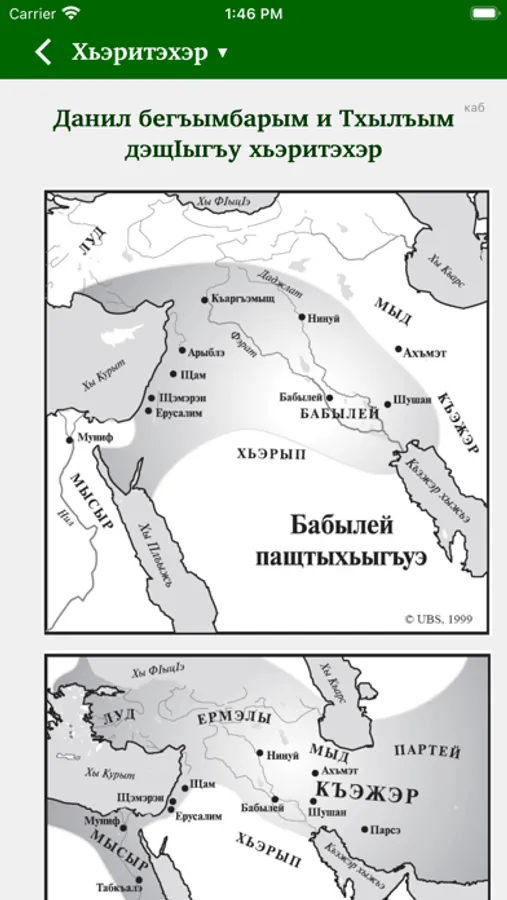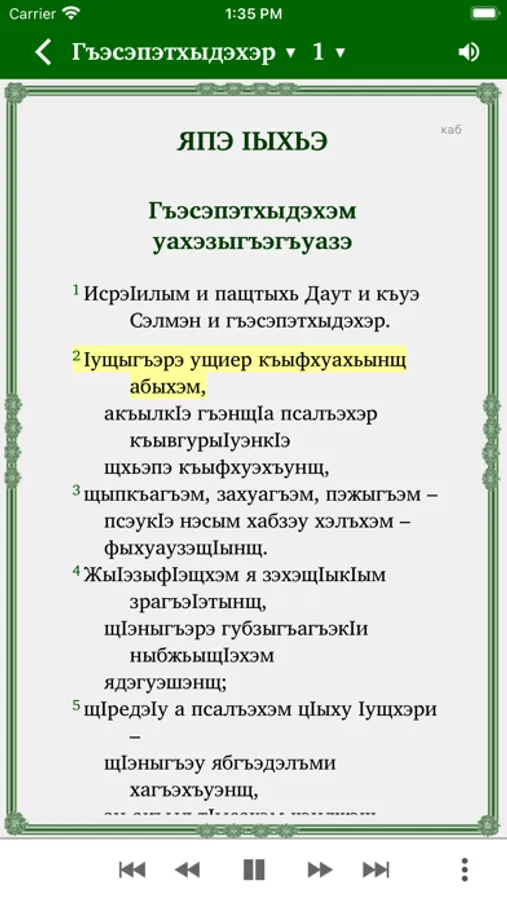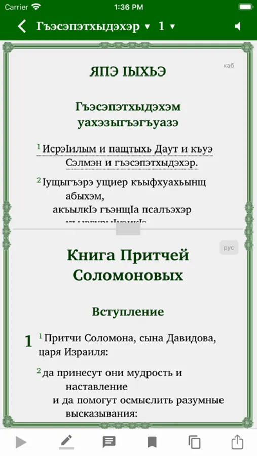 Это приложение предоставляет возможность изучения Священного Писания. Оно содержит как перевод на кабардино-черкесский язык, так и русский перевод, который можно по желанию подключать параллельно или в режиме "стих за стихом". Пользователи могут выделять стихи разными цветами, размещать закладки, писать заметки, просматривать историю чтений.