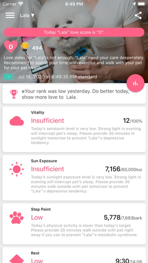 2. Manage the Vitality Index, Vitamin D Level, Ultraviolet Level, Daylight Exposure Level of Pets.