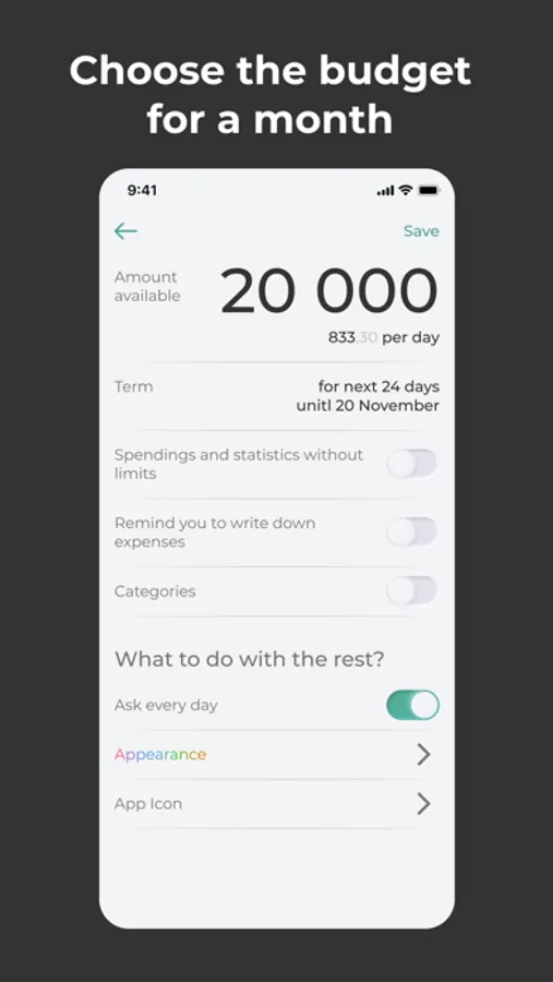 Enable reminders so that you don't forget to write down regular payments. If you haven't spent your entire planned budget by the end of the day, you can transfer the money you saved to the next day or distribute it evenly over the entire period. If you spend more, your daily budget will be recalculated automatically.