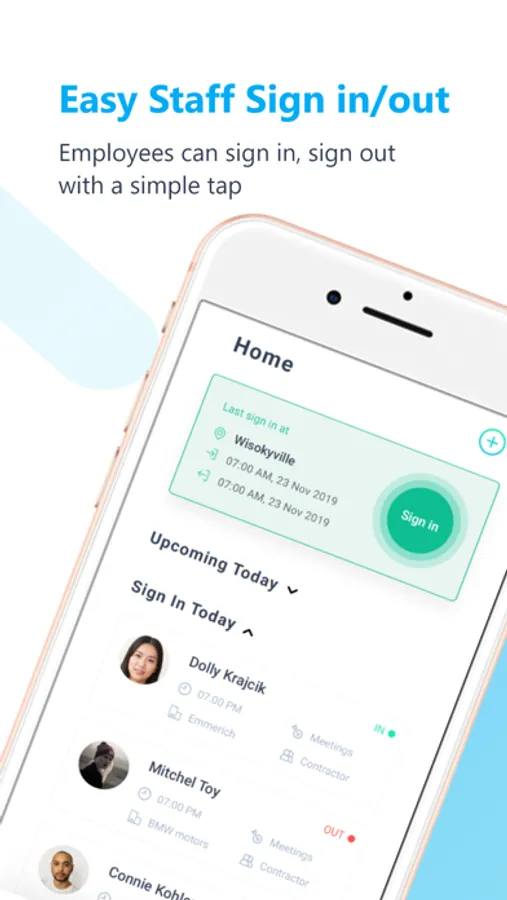 Simple and modern sign in/out at your workplace. Track staff movement at your workplace