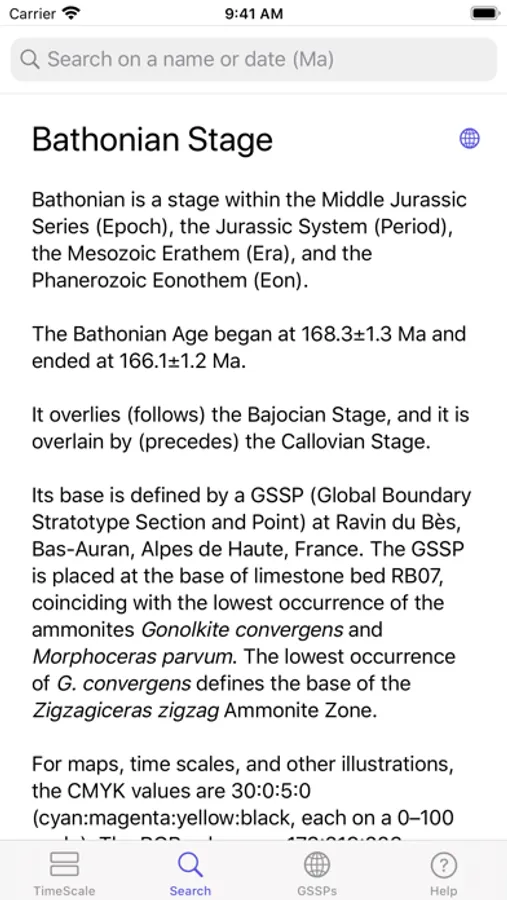 DeepTime puts geological time at your fingertips. DeepTime is a full interactive version of the latest geological time scale: tap on any time unit to see more detail about it, including how its GSSP (golden spike) is defined. It even has the CMYK and RGB color codes for every time unit, great for when you need to have the right color for a map or chart. Even more, it is completely searchable by name or age. Come across an unfamiliar time term in an older paper? Search for it, and you'll see how it relates to the modern time scale.