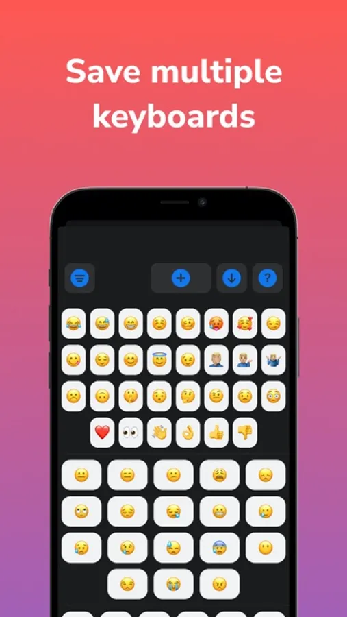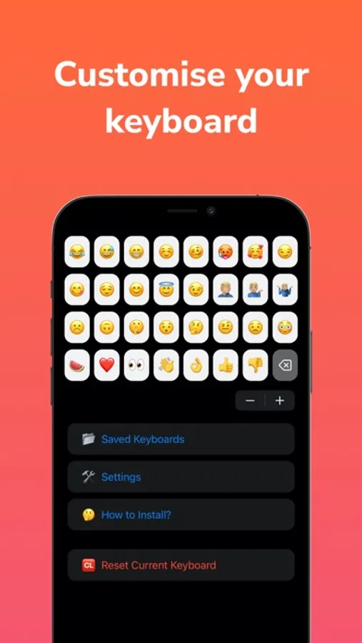 Emoji Keyboard lets you create your own keyboard containing all your favourite emojis. You won't have to find them in the traditional keyboard ever again. You can customize the emojis and the background colour of the keyboard.